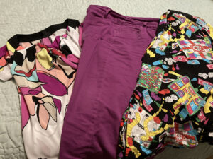 And voila there it is, there it is. I find a subtle touch of purple in a floral print shirt I’ve had for years that goes with the purplish pair of cropped pants I’ve also had for years that I still zip and button but never worn with that shirt. Sheer magic.